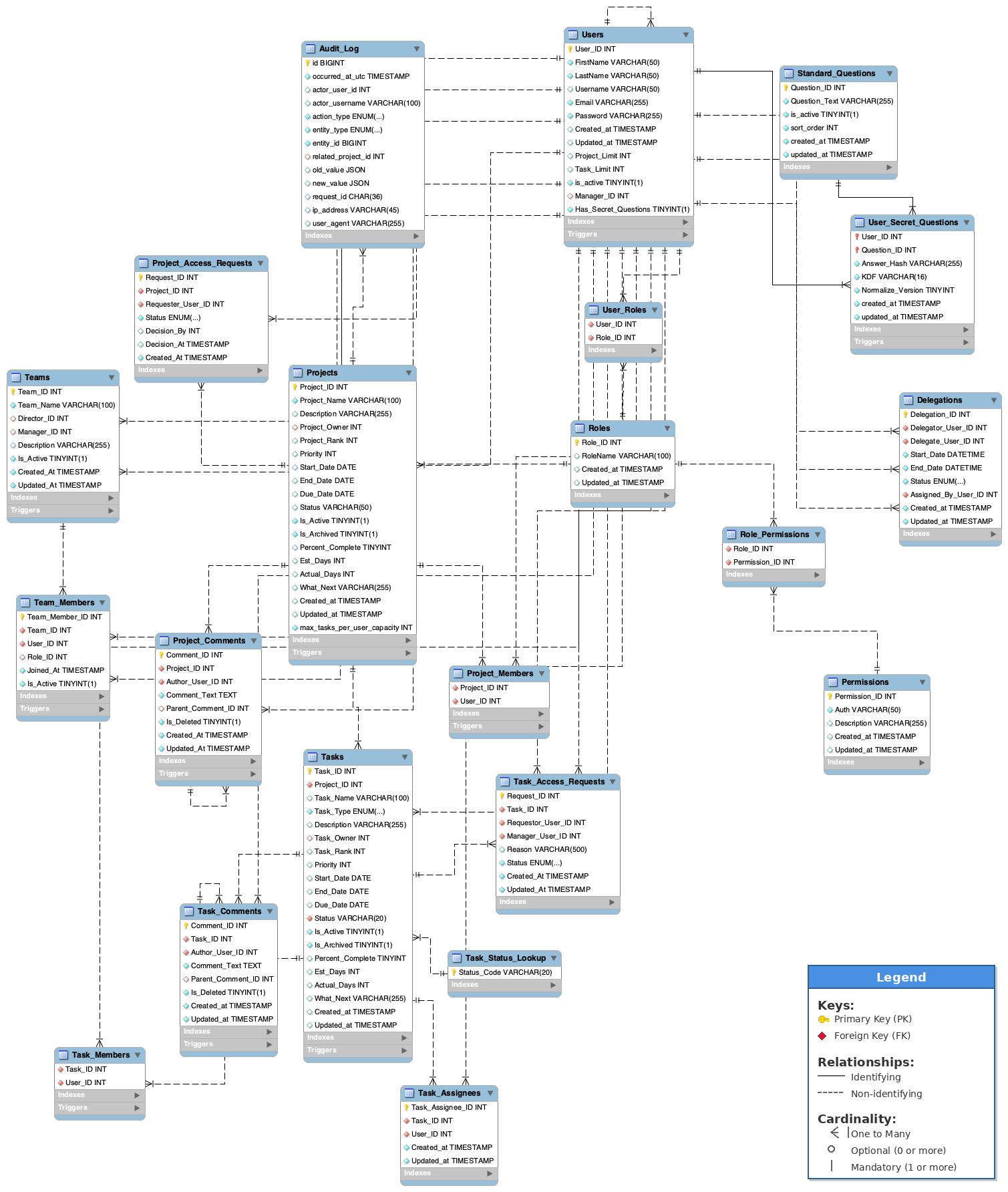 Finalized ERD showing relationships between Users, Roles, Projects, Tasks, and Teams. Exported by our team DBA: Greg San Agustin.